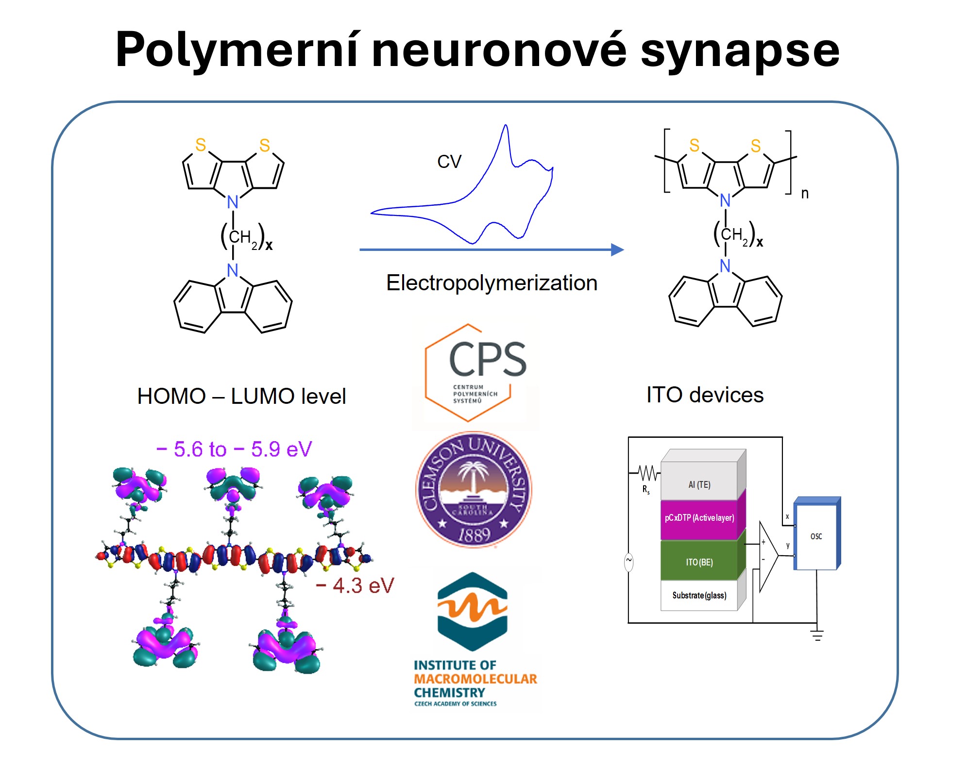Polymerní neuronové synapse, jehož řešitelkou je prof. Ing. Jarmila Vilčáková, Ph.D., ve spolupráci s Ústavem makromolekulární chemie AV ČR Praze, kdy projekt je řešen s Clemson University (USA) po dobu dvou let a bude pokračovat ještě další rok. Projekt se zabývá problematikou syntézy čtyř nových karbazolových derivátů dithienopyrrolu - monomerů pro přípravu konjugovaných polymerů pCxDTP s různou délkou postranních alkylových řetězců a přípravou sendvičových struktur vykazující memristivní chování ve stejnosměrném i střídavém elektrické poli. U vybraných polymerů byla pozorována schopnost napodobení synaptické plasticity.