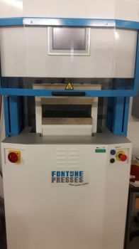 Hydraulic press for compression moulding and curing of samples made of various polymer materials. Platen size 320 x 320 mm Maximum temperature 300 °C Temperature and pressure control Storable table program with 3 phases on time base Closing force 300 kN